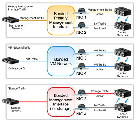 Bonded NICs - When considering whether or not to bond NICs, balance your requirement for redundancy and load balancing with the number of separate subnets and VLANs each resource pool requires. Depending on your redundancy requirements, you can connect bonded NICs to the same or separate switches. If you link bonded NICs to separate switches, you will mitigate the impact of switch failure. You must run the switches in a stacked configuration, in which the switches are configured to function as a single switch that is seen as a single domain