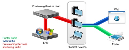 Traffic Isolation - When possible, vDisk streaming traffic should be isolated from normal production network traffic, such as Internet browsing, printing, and file sharing. It is best to use multiple NICs: a single NIC for PXE traffic and bonded NICs for streaming the vDisks to target devices. This separation provides more consistent performance to the streamed operating systems and prevents conflicts between the streaming traffic and the production network traffic