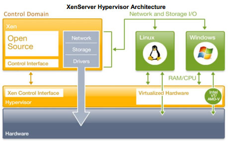 - Windows / Linux VM: uses paravirtualized kernels (L) and drivers to access storage and network I/O through the control domain. CPU & RAM are communicated directly to the Xen Hypervisor